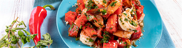 Florida Watermelon and Caprese Salad with Tomato, Cucumber and Crispy Prosciutto